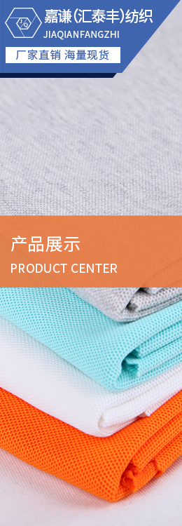 平紋布:各類拉架平紋、普通平紋、花式平紋,面料紋路清晰、光澤好,成分包括100C、100T、100N、T/C、CVC、N/C、N/T、MODAL、TENCEL、ROYAN、BAMBOO等,適宜合類休閑、運(yùn)動、時尚、商務(wù)及內(nèi)衣類服飾.<br /> 珠地布:各類單雙珠、六角、斜紋珠地,珠眼飽滿、顆粒清晰,伸縮保形性好,吸濕、透氣,可兼做抗紫外、吸濕導(dǎo)汗、香味等功能,適宜各類休閑、商務(wù)、運(yùn)動類T恤.<br /> 健康布:組織精密、紋路清晰、手感爽滑立挺,膚感強(qiáng),適宜各類運(yùn)動、休閑、時尚類服裝,成分包括100C、100T、T/C、CVC、C/R等.<br /> 衛(wèi)衣布:各類單、雙衛(wèi)衣,拉架衛(wèi)衣,布面肌理豐富,耳仔整齊,立體飽滿,有良好的吸濕透氣及保暖功能.<br /> 不倒絨:保暖、透氣,不起球、不掉毛,適宜合類休閑套裝,情侶、新套裝、保暖內(nèi)衣.<br /> 橫機(jī)面料:11、22及提花類,用于各類領(lǐng)袖及下欄配套.<br/>